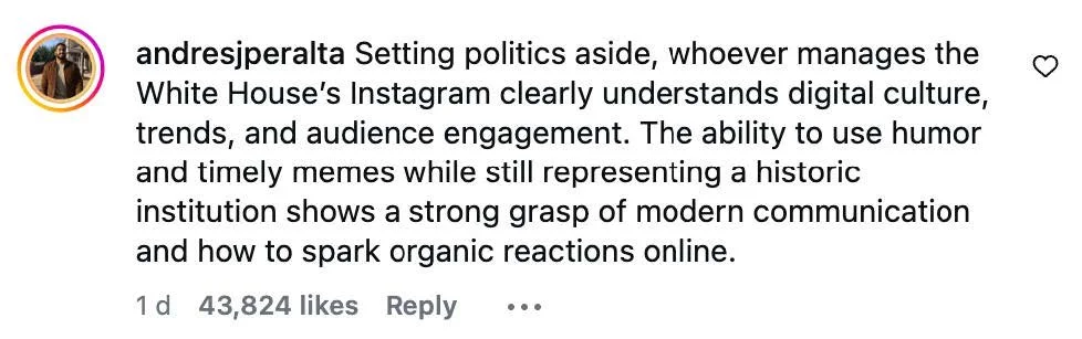 With that said, the blurring of political messaging and entertainment is worrying and has been happening for some time now. It feels that underpinning the White House’s meme communications ‘strategy’ is a kind of nihilism that government is just another form of entertainment with no moral mission or real accountability.